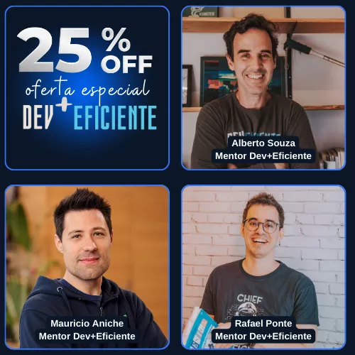 Os mentores Dev + Eficiente estão atuando no mercado e em empresas muito relevantes. Essa é uma combinação que você dificilmente encontra em qualquer outro treinamento. Eles estão constantemente estudando e tentando estressar os limites de como entregar código com qualidade e ainda tem a oportunidade de confrontar e testar diretamente no mercado, em desafios de larga escala.